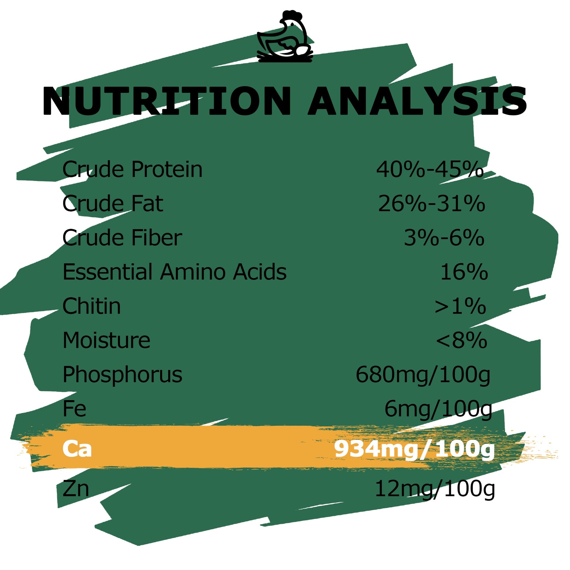 What sets our BSF larvae apart from other brands is the exceptional quality of our base feed. Our larvae thrive on a specially formulated diet that is vegetable and kelp-based, providing a natural and fully traceable source of nutrition. Unlike other brands, we prioritize the use of high-quality ingredients, ensuring that our BSF larvae not only meet but exceed the standards for natural, wholesome, and traceable feed. This commitment to excellence in our base feed translates to superior nutritional benefits for your animals.